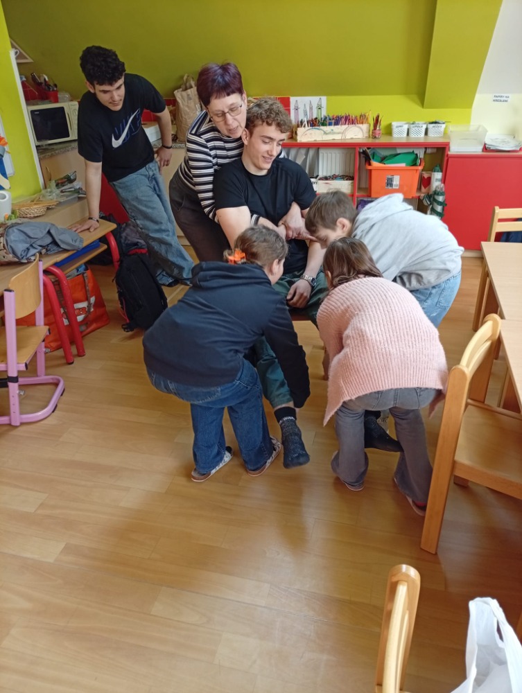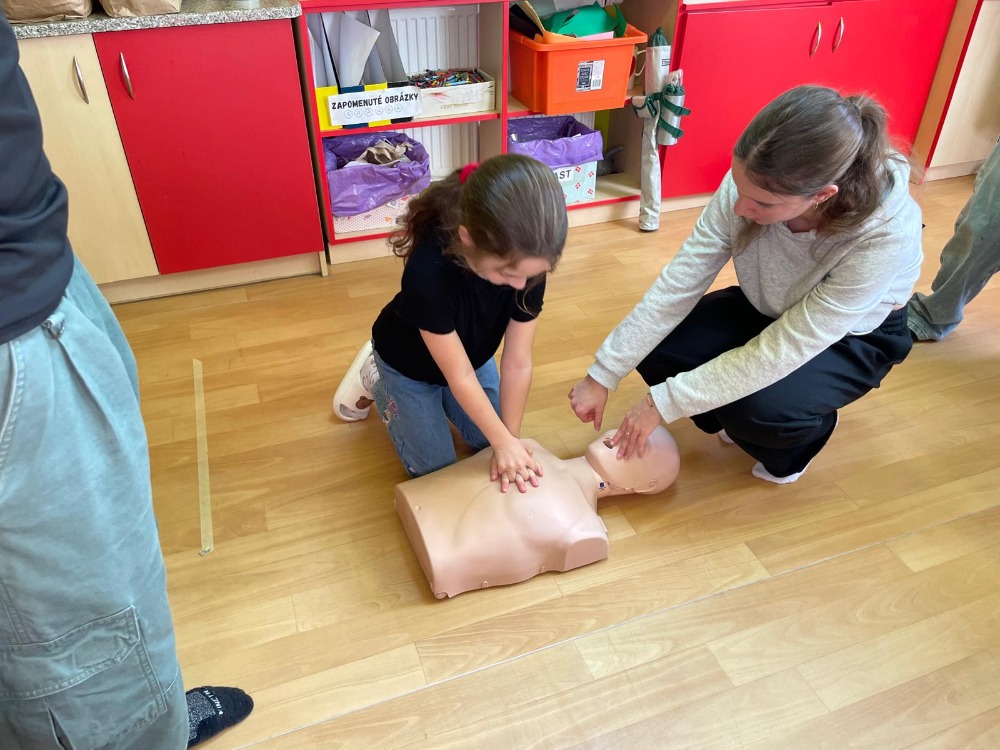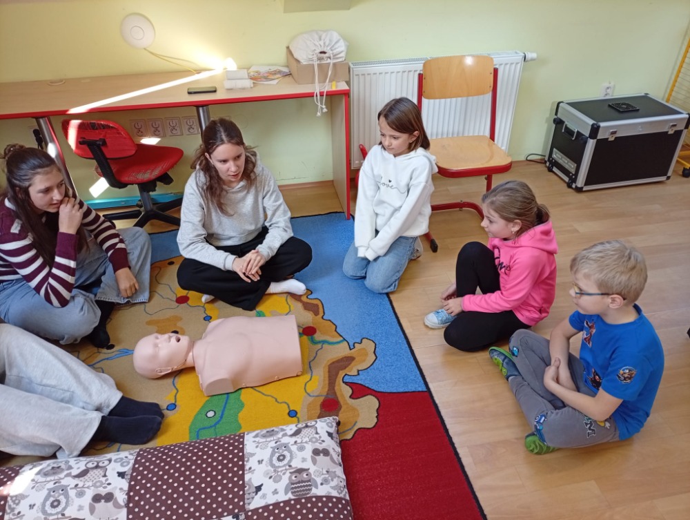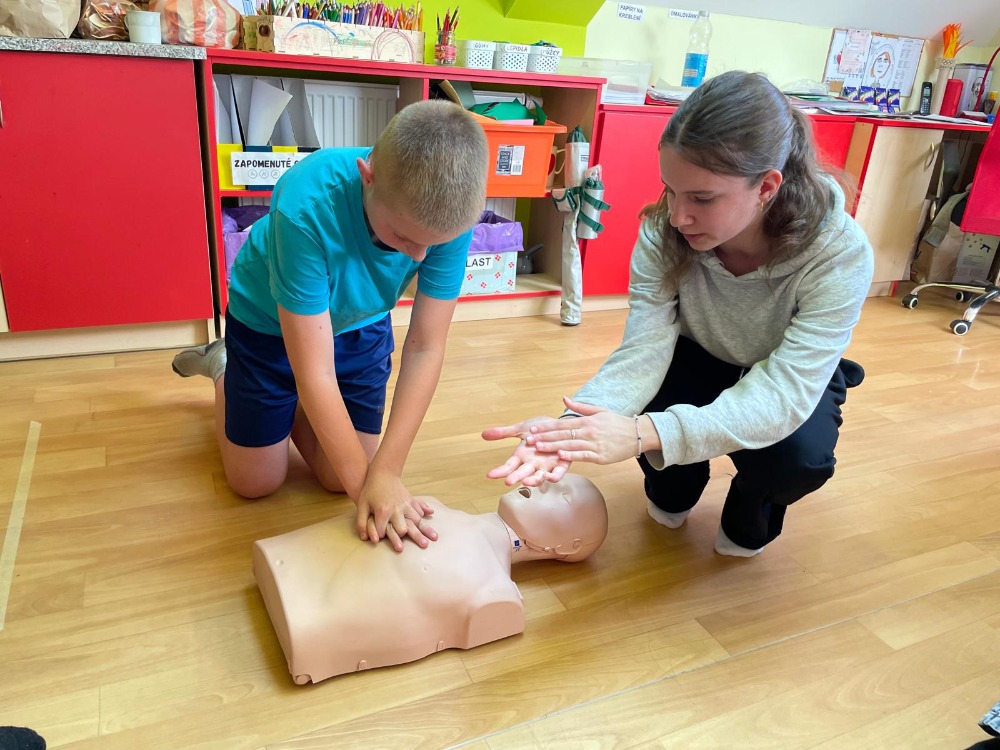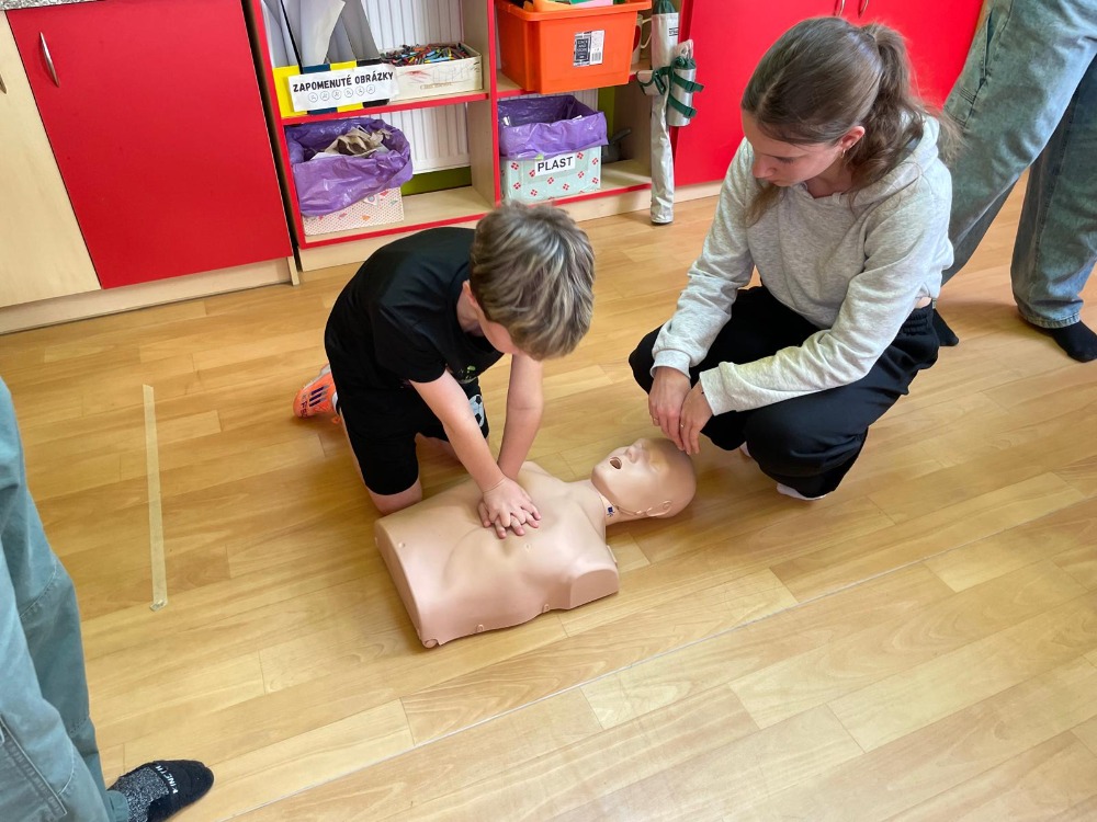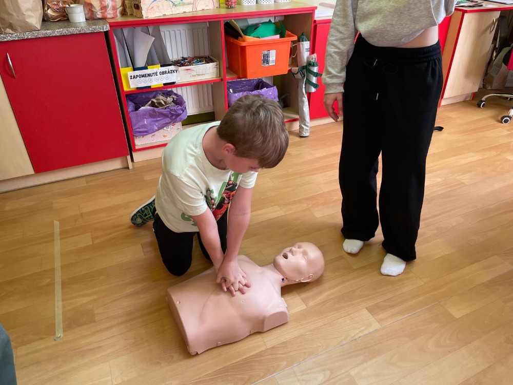 Dnes nás navštívili žáci hronovské základní školy, kteří navštěvují zdravotnický kroužek pod vedením paní Aleny Urbanové. Dozvěděli jsme se, jak správně postupovat při poskytování první pomoci – a nezůstalo to jen u teorie. Sami jsme si vyzkoušeli masáž srdce, ošetření zlomené ruky, práci s obvazy a i to, jak správně postupovat u nehybného člověka v bezvědomí. Povídali jsme si také o důležitých situacích ze života – co dělat, když se něco stane spolužákovi nebo někomu z rodiny, jak správně reagovat a jaká jsou telefonní čísla na záchranné složky. Ti nejmenší si navíc hravou formou vyzkoušeli, jak dobře znají jednotlivé části lidského těla.